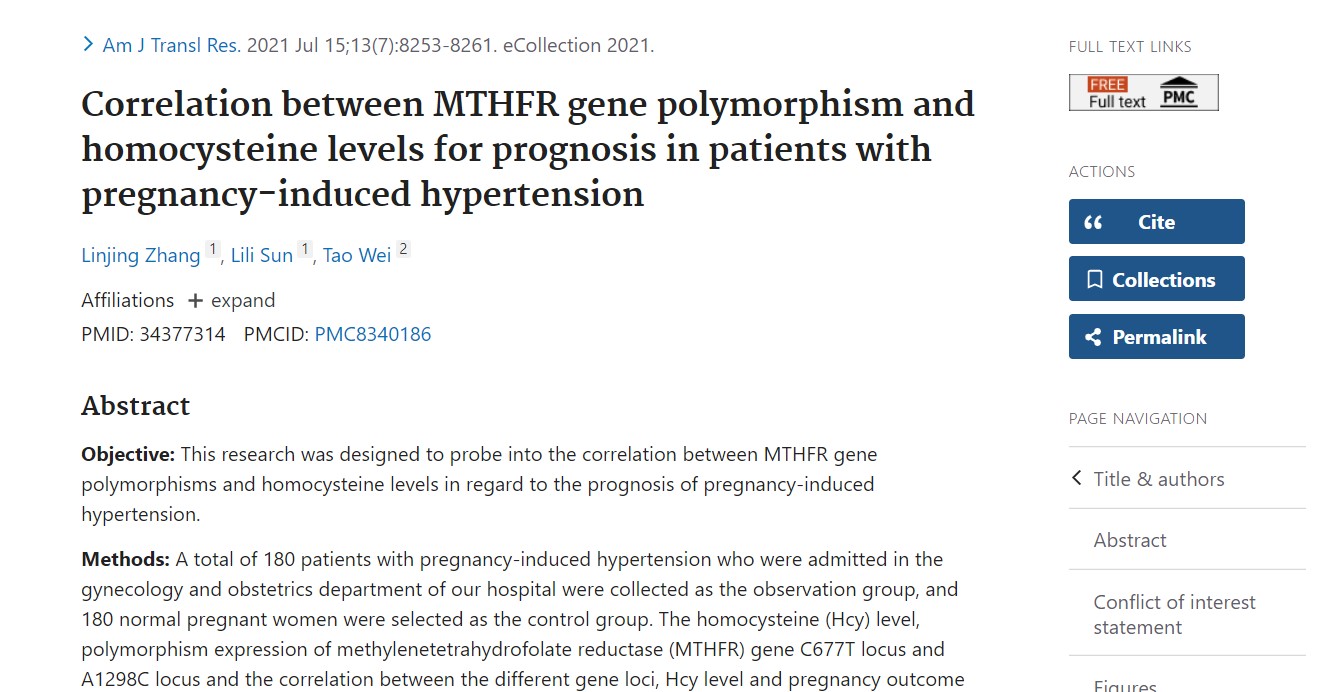 2021 m. straipsnis „American Journal of Translational“. Tyrimai tiksliai nustatė, kaip MTHFR 677TT nukreipia gestacinį mastą hipertenzija (GH).