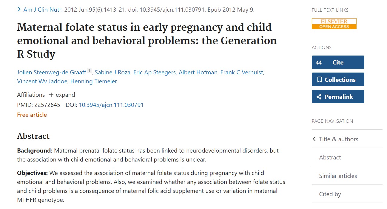 Šis tyrimas, žinomas kaip R kartos kohortos tyrimas ir paskelbtas autoritetingameAmerican Journal of Clinical Nutrition, paryškintas an ryšys tarp folio rūgšties ir vaikų emocinio vystymosi, skiriasi nuo gerai žinomas jo vaidmuo užkertant kelią nervinio vamzdelio defektams.