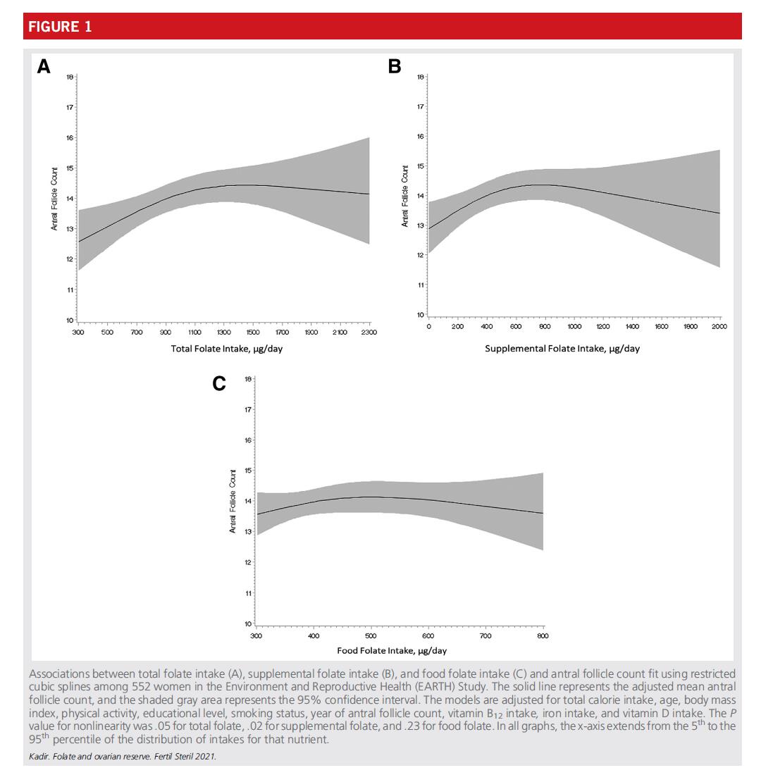 Duomenys parodė, kad teigiama koreliacija tarp bendras folio rūgšties suvartojimas ir AFC pasiekia plynaukštę maždaug1200 mikrogramų per dieną. Didžiausia nauda vartojant folio rūgštį iš maisto papildų (sintetinės folio rūgšties folio rūgšties) atsiranda maždaug800 mikrogramų per dieną. Palyginti su moterimis su kasdien suvartoti 400 mikrogramų folio rūgšties, vartojantys 800 mikrogramų per dieną tikimasi, kad jų skaičius padidės maždaug1,5 folikulo.