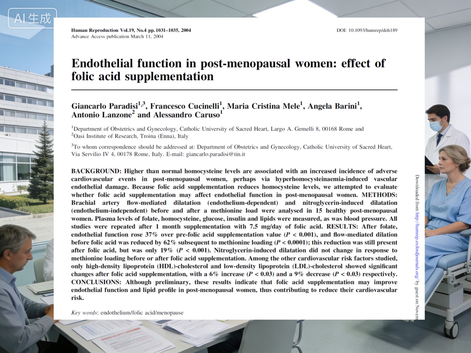 A 2004 m. paskelbtas reikšmingas tyrimas Žmogaus reprodukcija (IF 6.1) pagal Giancarlo Paradisi, Francesco Cucinelli ir kolegos daugiausia dėmesio skyrė moterys po menopauzės. Penkiolika sveikų dalyvių, tipinių atstovų pomenopauzinė būklė, užtruko 7,5 mg per parą folio rūgšties vieną mėnesį. Rezultatai parodė ryškius patobulinimus: