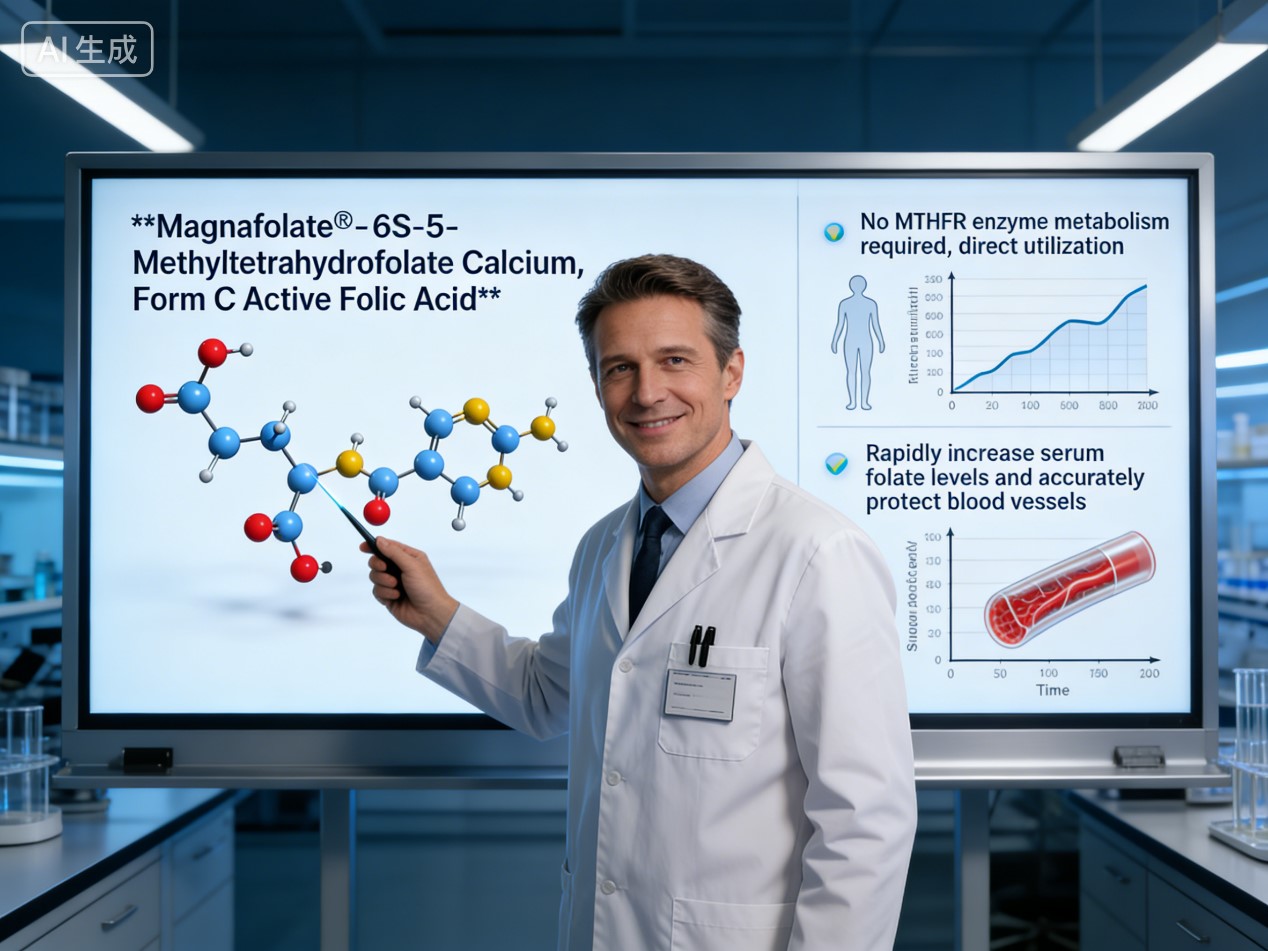 Magnafolatas®, a 6S-5-metiltetrahidrofolatas kalcio (Crystalline Active Folate), atitinka tai pagrindinis klinikinis poreikis. Kaip iš prigimties aktyvus folio rūgštis, jam reikia nėra MTHFR fermento medžiagų apykaitą ir patenka į kūną paruoštas naudoti nedelsiant, greitai prisijungia prie HCY gedimo kelio, kad tai pašalintų“tyli abrazyvinis”laivų. Jis greitai padidina folio rūgšties kiekį serume lygius, leidžiančius laiku ir tikslingai apsaugoti kraujagysles, puikiai tinkančias pomenopauziniai fermentiniai pokyčiai, taip pašalinant“papildyti, bet neįsisavinti”problema.
