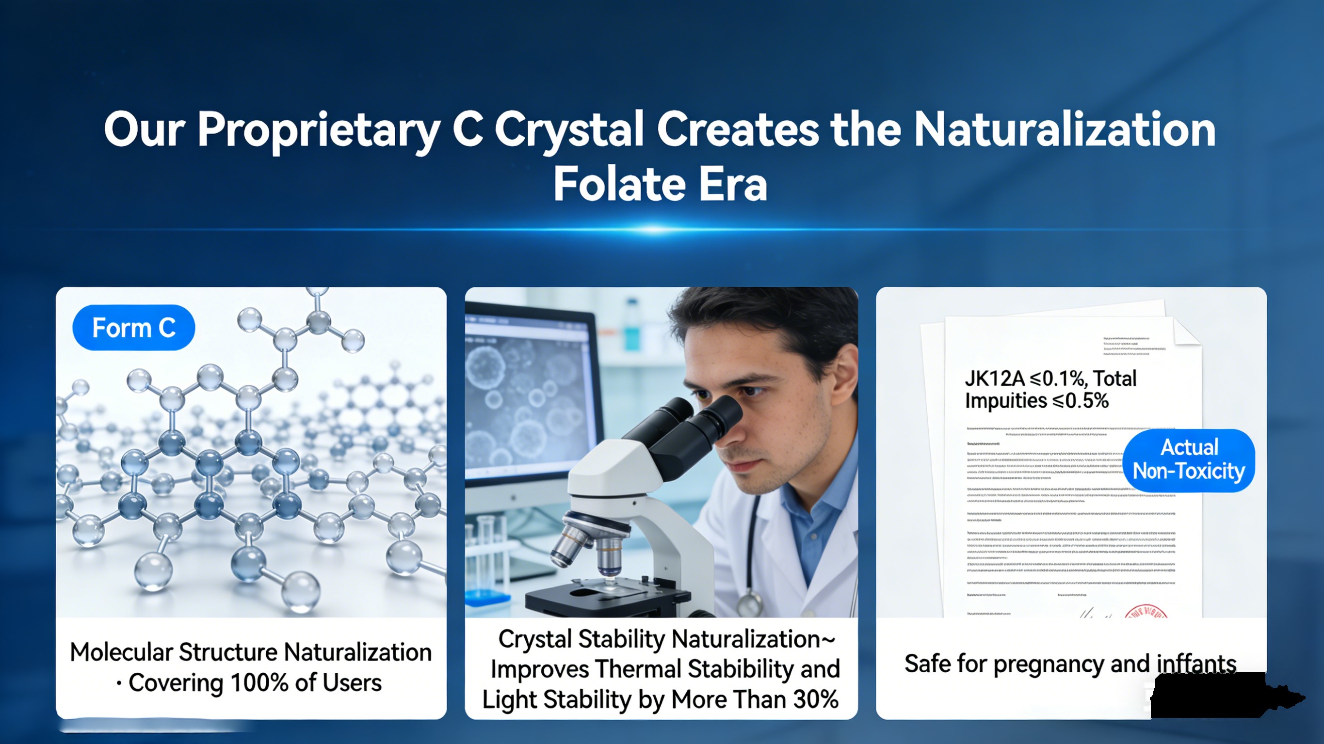 Remdamiesi mūsų C-crystal patentu, mes tapome pradininkais „Natūralizacijos folio rūgšties“ kategorija, pelniusi pirmąjį pasaulinį sertifikatą. Tiesa Aišku, kad natūralizacija turi atitikti tris pagrindinius kriterijus skiriant jį nuo bendrojo I kristalo aktyvaus folio rūgšties: