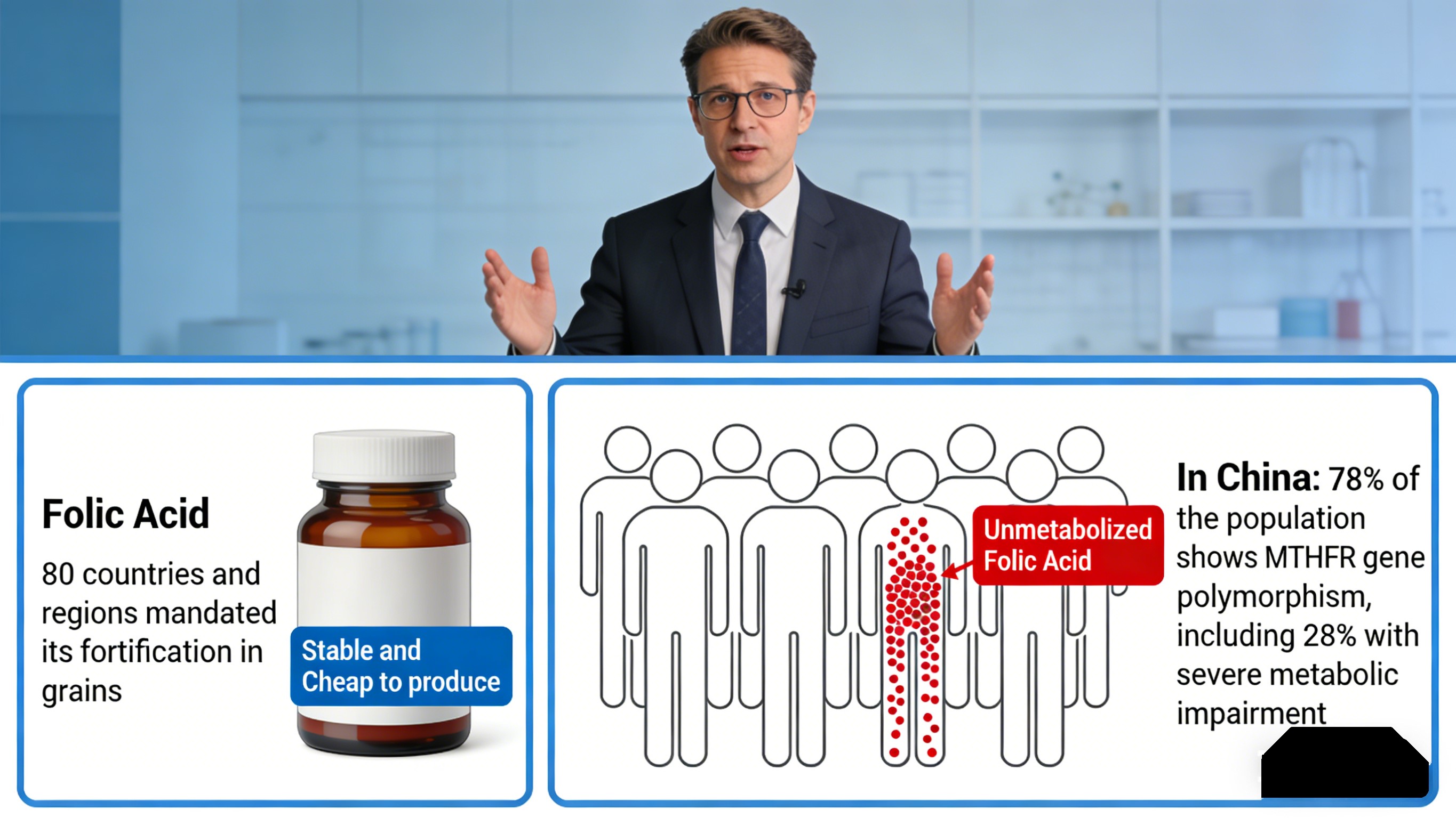 Praktiškai beveik 30% Kinijos žmonių negali veiksmingai paversti folio rūgšties, todėl papildymas neveiksmingas ir galimą nemetabolizuotos folio rūgšties kaupimąsi, kuri gali maskuoti vitamino B12 trūkumą ir trukdo cinko pasisavinimui. Įmonėms tai reiškia vartotojų skundai ir rizika reputacijai.