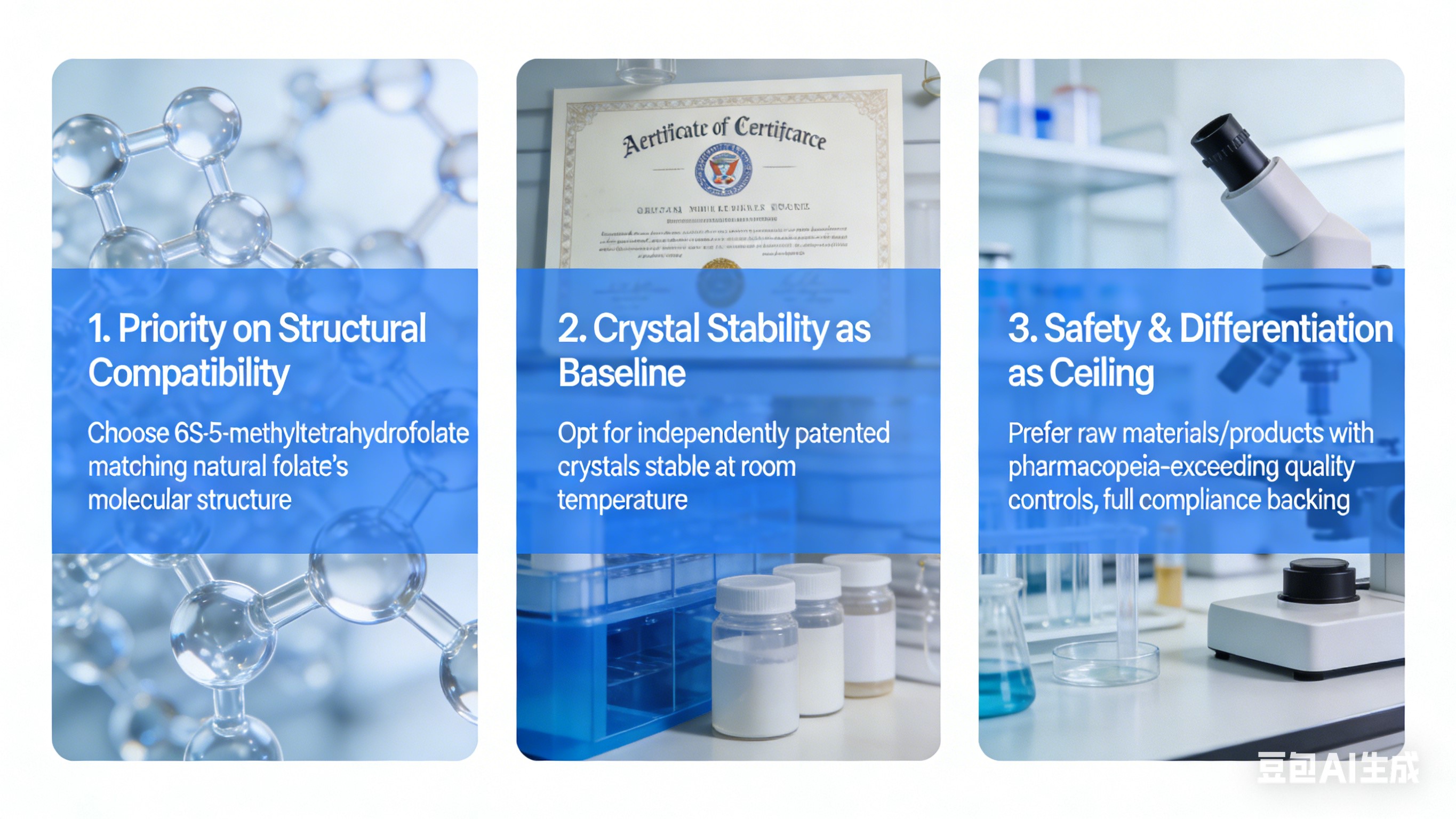 1. Pirmenybė struktūriniam suderinamumui: Pasirinkite 6S-5-metiltetrahidrofolato atitiktį natūrali folio rūgšties molekulinė struktūra – tiesioginė absorbcija, apima viską vartotojų, apsaugo nuo neveiksmingumo.2. Kristalų stabilumas kaip pradinė padėtis: Pasirinkite nepriklausomai patentuotus stabilius kristalus kambario temperatūroje, kad būtų užtikrintas partijos nuoseklumas ir etiketė atitikties.